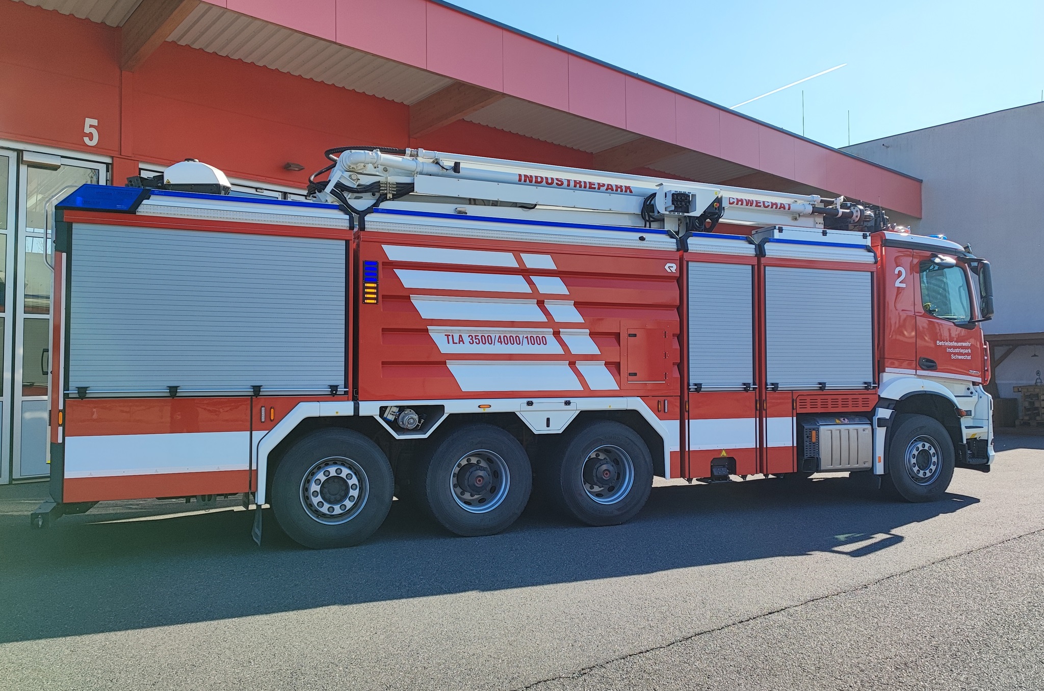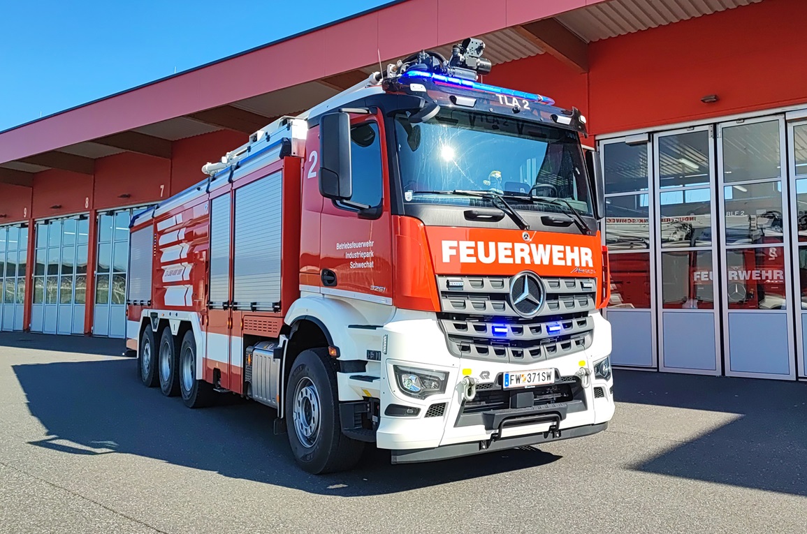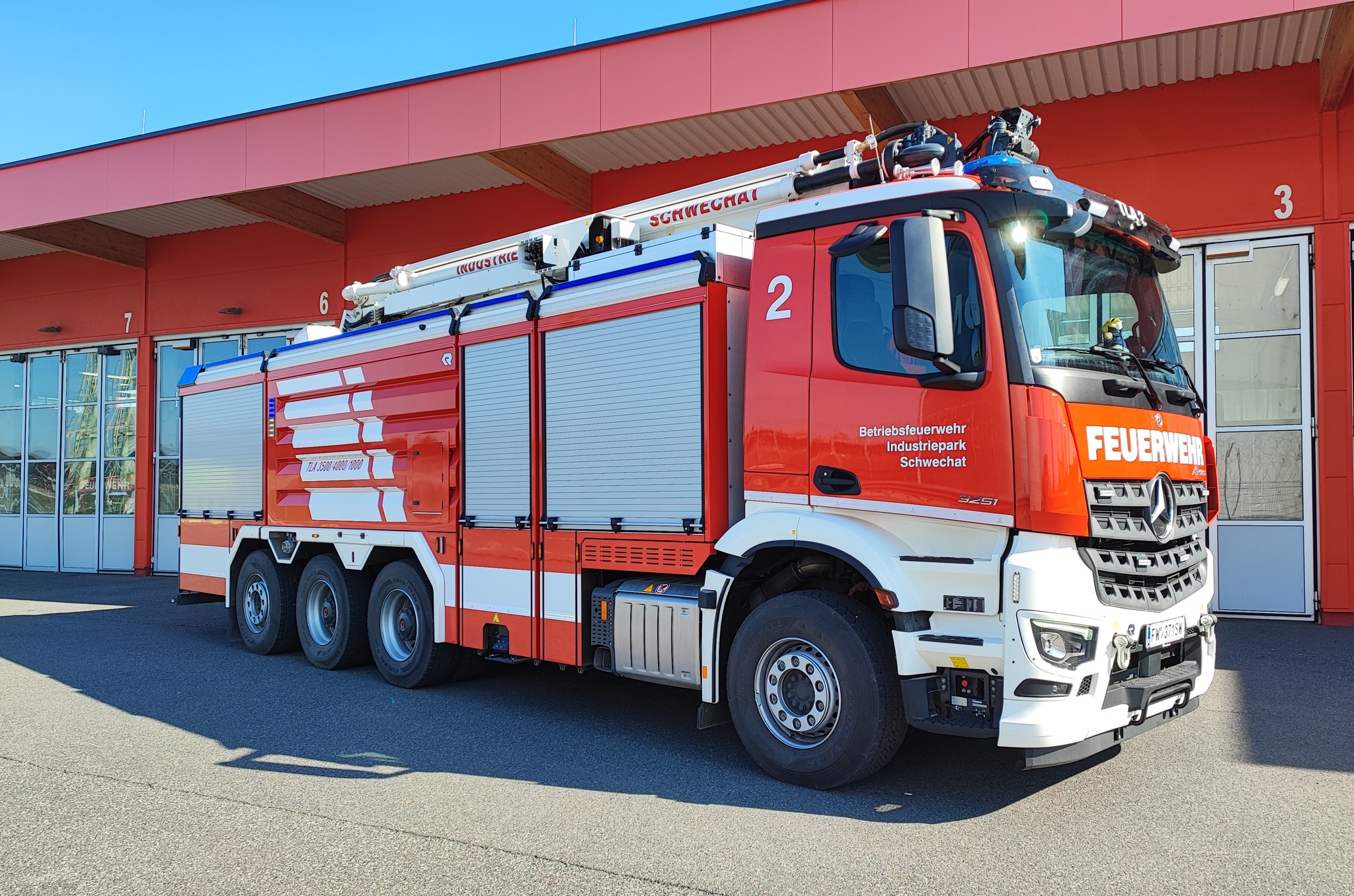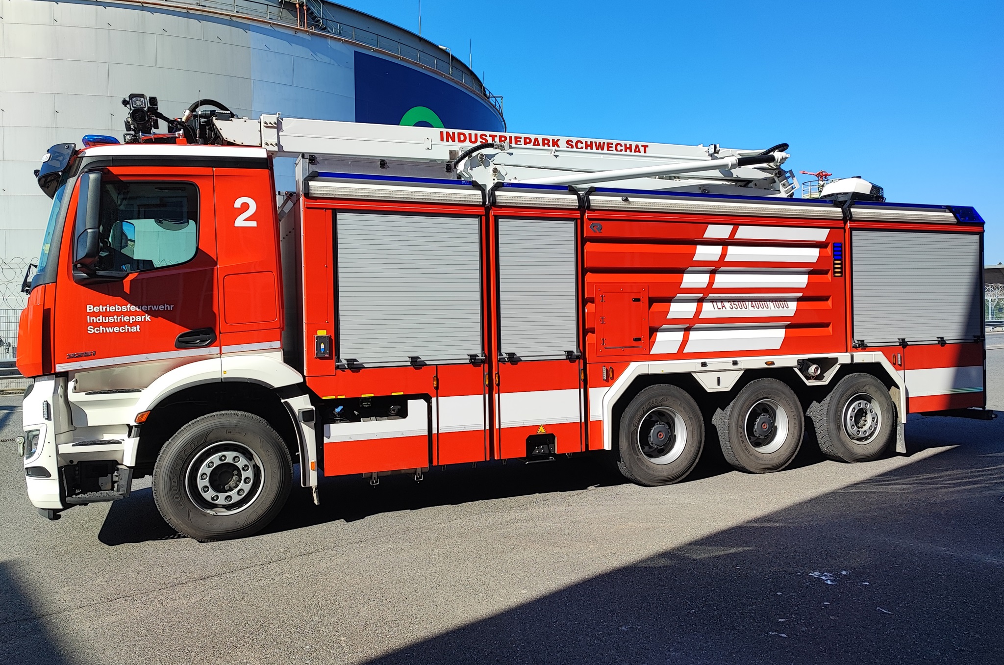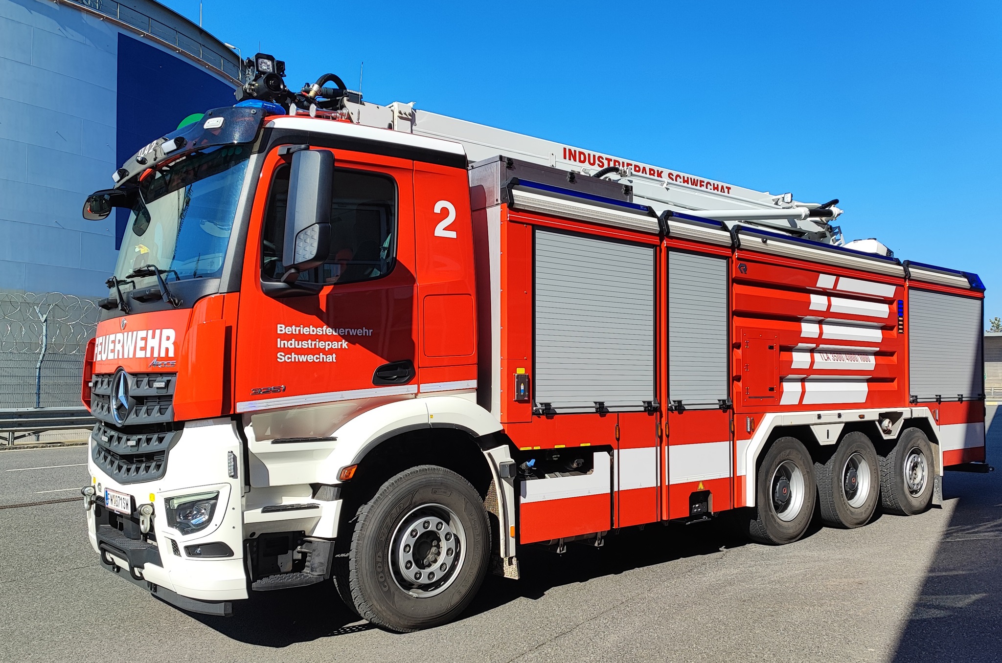 Ende Februar erhielt die Betriebsfeuerwehr Industriepark Schwechat das Nachfolgefahrzeug für das in die Jahre gekommene Universallöschfahrzeug mit Löscharm. Es handelt sich bei dem neuen Feuerwehrfahrzeug um ein Universallöschfahrzeug der Marke Mercedes Arocs.